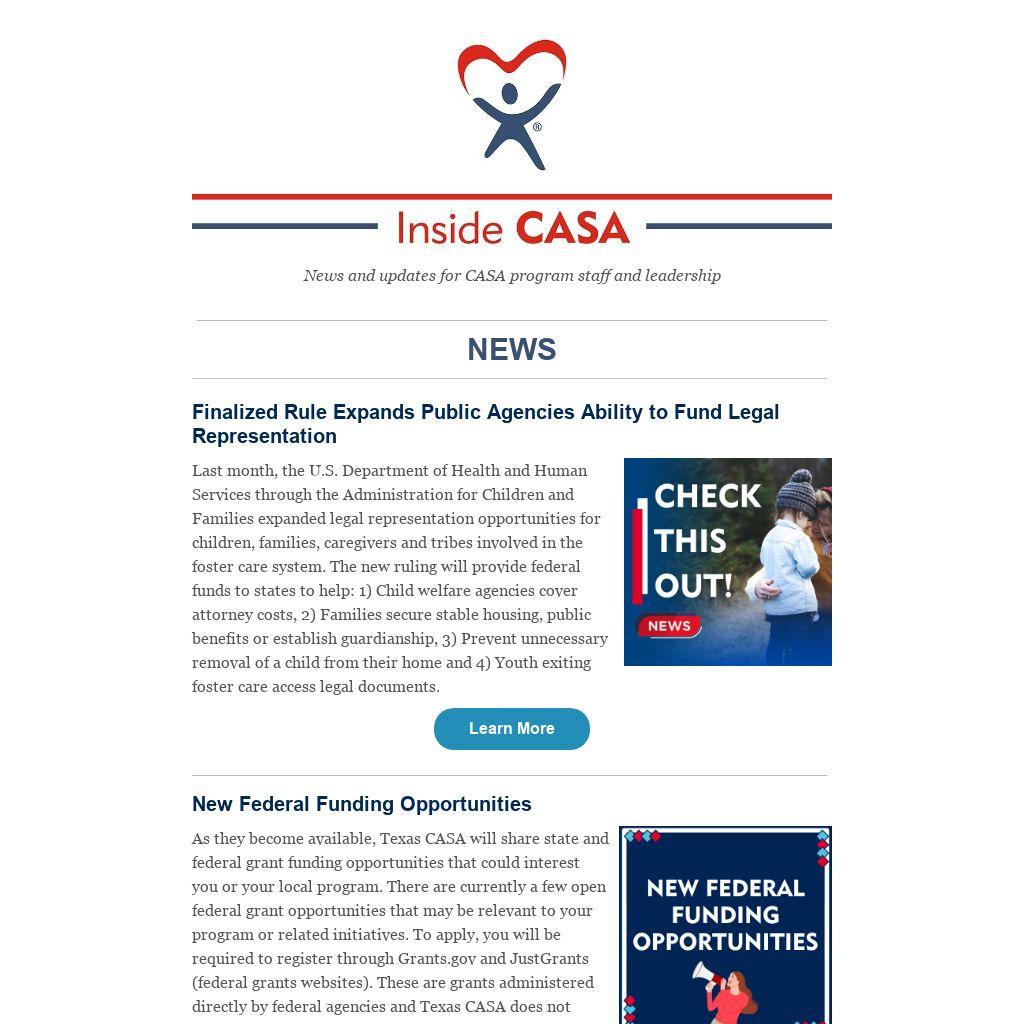 As they become available, Texas CASA will share state and federal grant funding opportunities that could interest you or your local program. There are currently a few open federal grant opportunities that may be relevant to your program or related initiatives. To apply, you will be required to register through Grants.gov and JustGrants (federal grants websites). These are grants administered directly by federal agencies and Texas CASA does not manage or participate in these grants.