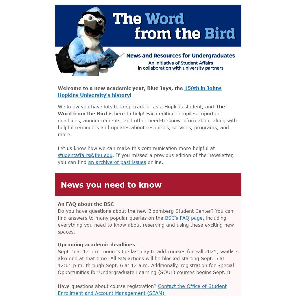 We know you have lots to keep track of as a Hopkins student, and The Word from the Bird is here to help! Each edition compiles important deadlines, announcements, and other need-to-know information, along with helpful reminders and updates about resources, services, programs, and more.