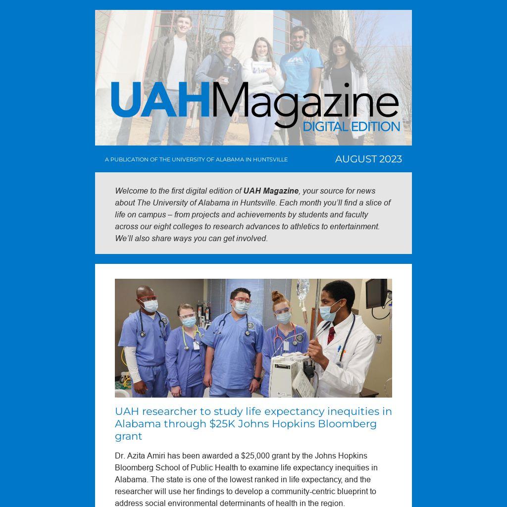 UAH Magazine, Digital Edition, replaces UAH’s Impact and Community Leaders e-newsletters in a fresh format that combines and expands the content of those publications. It will arrive in your inbox monthly.