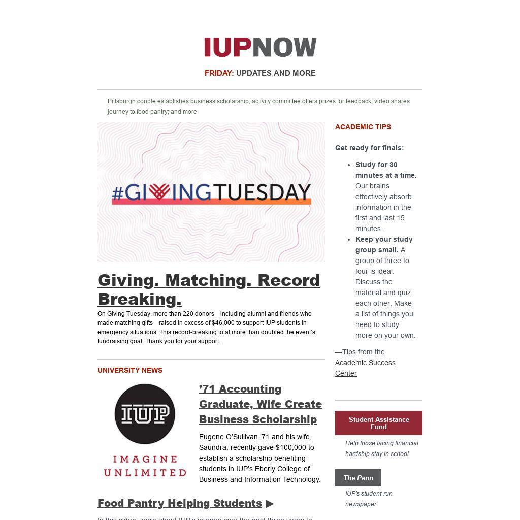 Distributed to IUP employees and students four days a week, IUP Now is the official newsletter of Indiana University of Pennsylvania. It features news from across the IUP website, compiled by the Division of Marketing and Communications. Find out how to get your news and events in IUP Now.