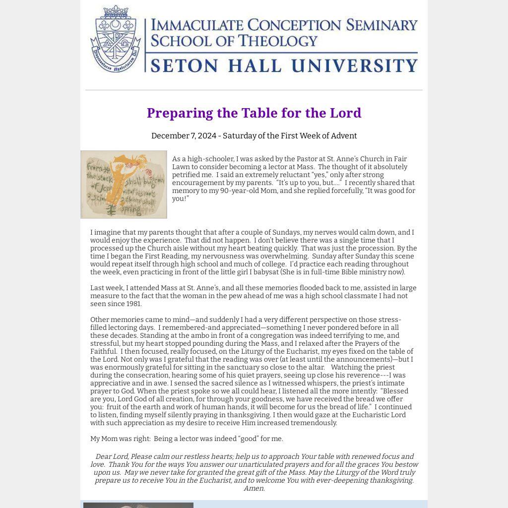 Other memories came to mind—and suddenly I had a very different perspective on those stress- filled lectoring days. I remembered-and appreciated—something I never pondered before in all these decades. Standing at the ambo in front of a congregation was indeed terrifying to me, and stressful, but my heart stopped pounding during the Mass, and I relaxed after the Prayers of the Faithful. I then focused, really focused, on the Liturgy of the Eucharist, my eyes fixed on the table of the Lord. Not only was I grateful that the reading was over (at least until the announcements)—but I was enormously grateful for sitting in the sanctuary so close to the altar. Watching the priest during the consecration, hearing some of his quiet prayers, seeing up close his reverence---I was appreciative and in awe. I sensed the sacred silence as I witnessed whispers, the priest’s intimate prayer to God. When the priest spoke so we all could hear, I listened all the more intently: “Blessed are you, Lord God of all creation, for through your goodness, we have received the bread we offer you: fruit of the earth and work of human hands, it will become for us the bread of life.” I continued to listen, finding myself silently praying in thanksgiving. I then would gaze at the Eucharistic Lord with such appreciation as my desire to receive Him increased tremendously.