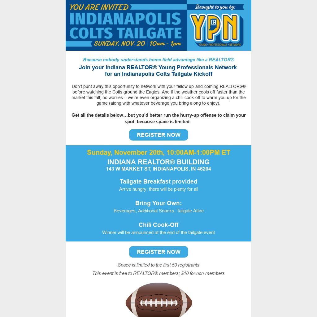 Don’t punt away this opportunity to network with your fellow up-and-coming REALTORS® before watching the Colts ground the Eagles. And if the weather cools off faster than the market this fall, no worries – we’re even organizing a chili cook-off to warm you up for the game (along with whatever beverage you bring along to enjoy).