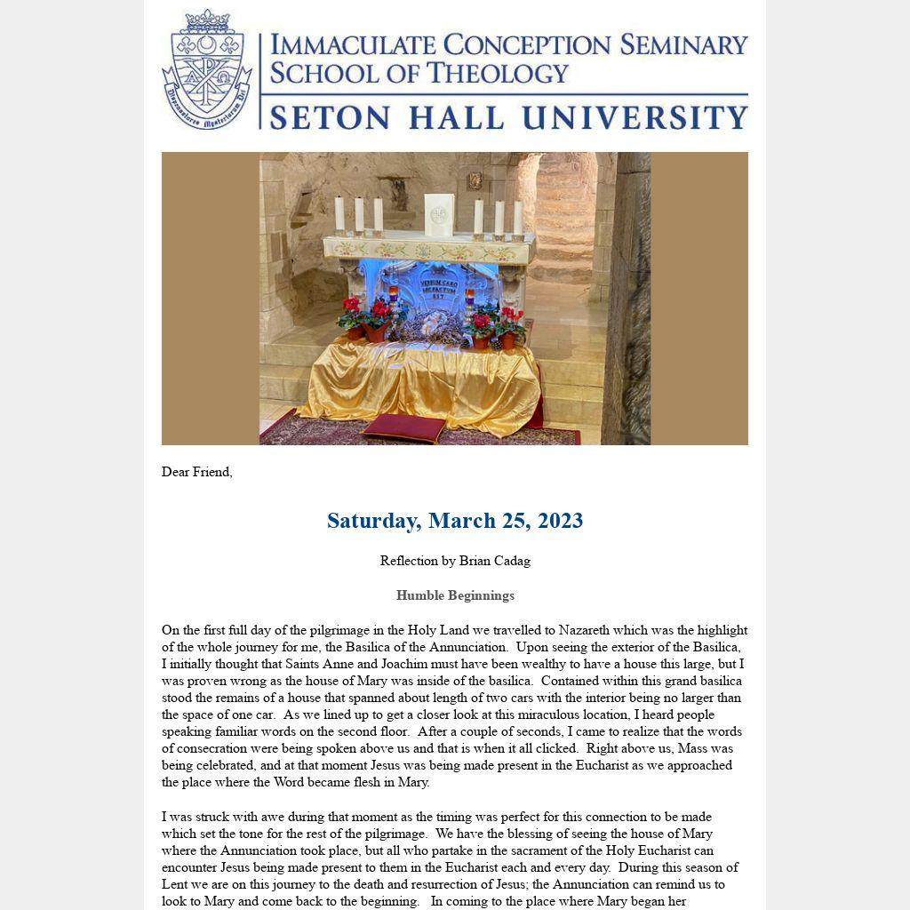 I was struck with awe during that moment as the timing was perfect for this connection to be made which set the tone for the rest of the pilgrimage. We have the blessing of seeing the house of Mary where the Annunciation took place, but all who partake in the sacrament of the Holy Eucharist can encounter Jesus being made present to them in the Eucharist each and every day. During this season of Lent we are on this journey to the death and resurrection of Jesus; the Annunciation can remind us to look to Mary and come back to the beginning. In coming to the place where Mary began her motherhood we are reminded that this was only the beginning of her journey with Jesus.