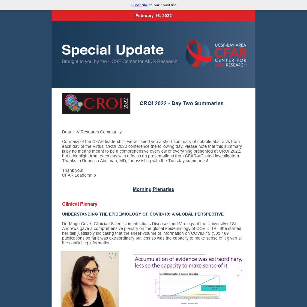 Courtesy of the CFAR leadership, we will send you a short summary of notable abstracts from each day of the Virtual CROI 2022 conference the following day. Please note that this summary is by no means meant to be a comprehensive overview of everything presented at CROI 2022, but a highlight from each day with a focus on presentations from CFAR-affiliated investigators. Thanks to Rebecca Abelman, MD, for assisting with the Tuesday summaries!