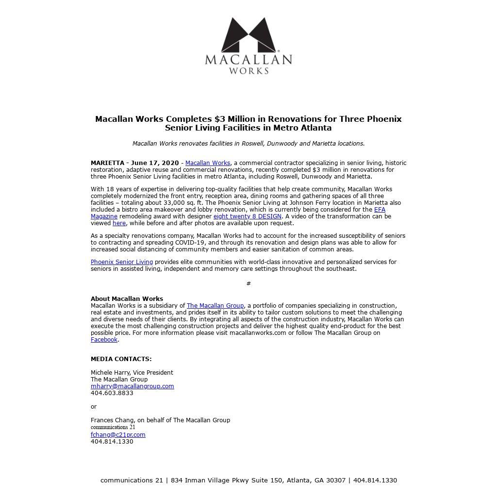 With 18 years of expertise in delivering top-quality facilities that help create community, Macallan Works completely modernized the front entry, reception area, dining rooms and gathering spaces of all three facilities – totaling about 33,000 sq. ft. The Phoenix Senior Living at Johnson Ferry location in Marietta also included a bistro area makeover and lobby renovation, which is currently being considered for the EFA Magazine remodeling award with designer eight twenty 8 DESIGN. A video of the transformation can be viewed here, while before and after photos are available upon request. As a specialty renovations company, Macallan Works had to account for the increased susceptibility of seniors to contracting and spreading COVID-19, and through its renovation and design plans was able to allow for increased social distancing of community members and easier sanitation of common areas. Phoenix Senior Living provides elite communities with world-class innovative and personalized services for seniors in assisted living, independent and memory care settings throughout the southeast.