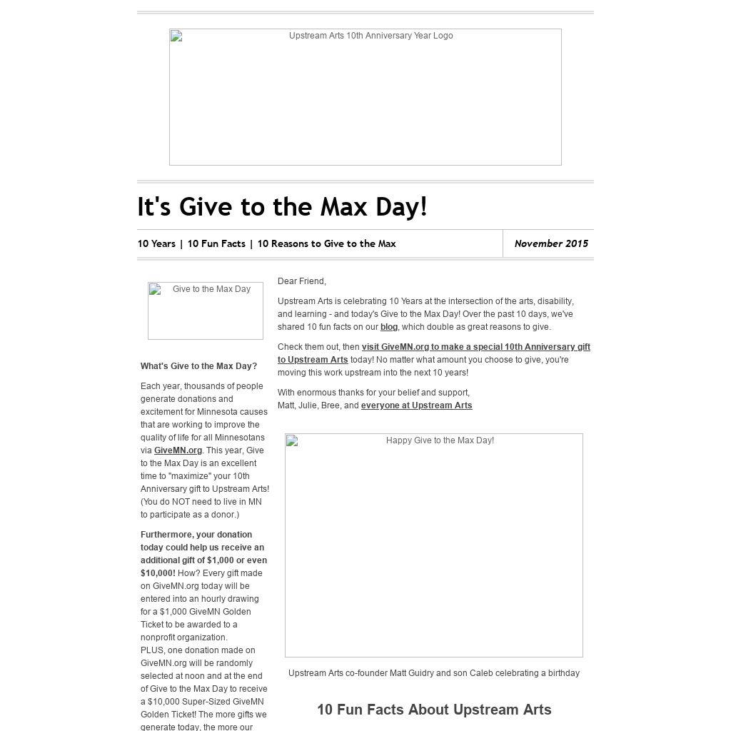 Each year, thousands of people generate donations and excitement for Minnesota causes that are working to improve the quality of life for all Minnesotans via GiveMN.org. This year, Give to the Max Day is an excellent time to "maximize" your 10th Anniversary gift to Upstream Arts! (You do NOT need to live in MN to participate as a donor.)