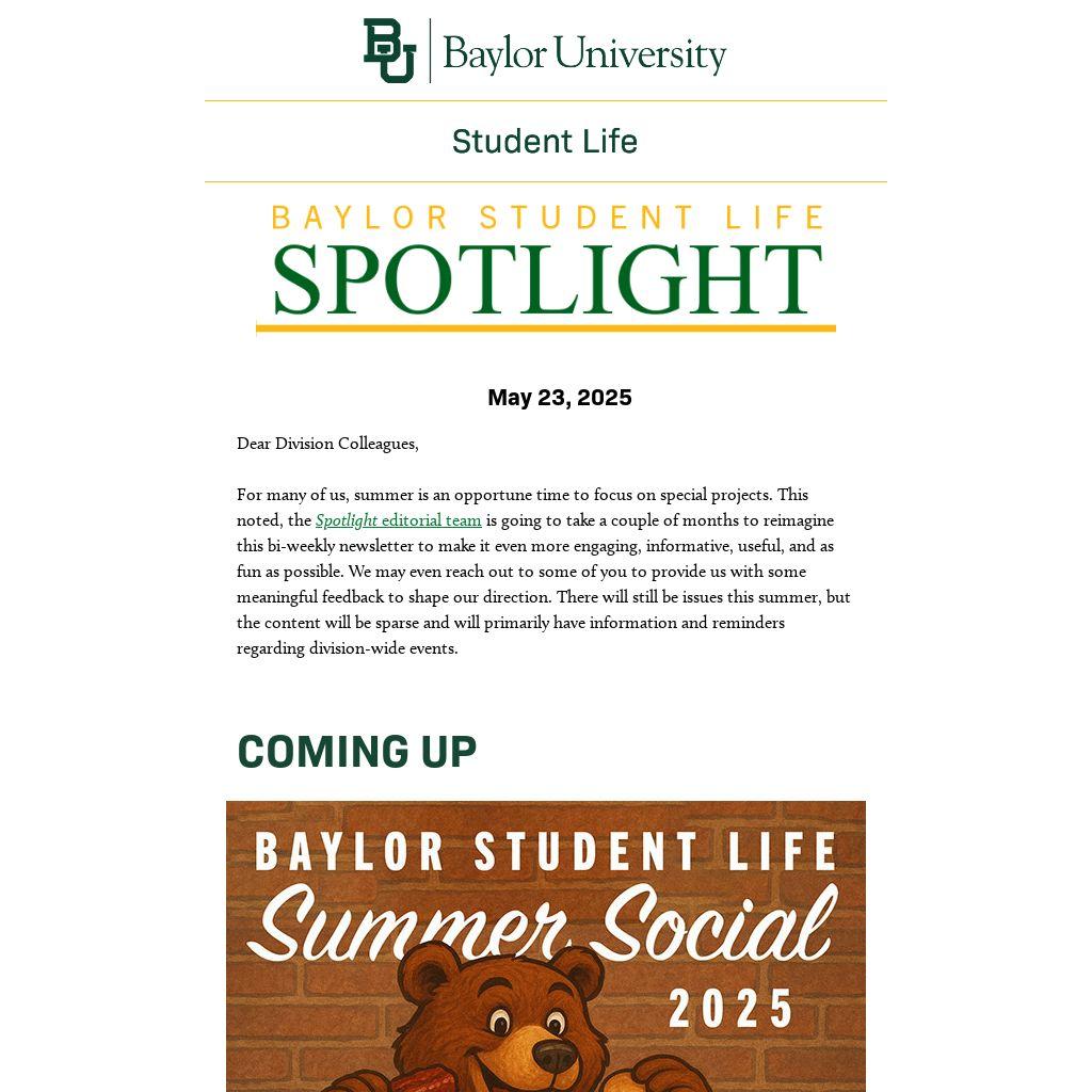 For many of us, summer is an opportune time to focus on special projects. This noted, the Spotlight editorial team is going to take a couple of months to reimagine this bi-weekly newsletter to make it even more engaging, informative, useful, and as fun as possible. We may even reach out to some of you to provide us with some meaningful feedback to shape our direction. There will still be issues this summer, but the content will be sparse and will primarily have information and reminders regarding division-wide events.