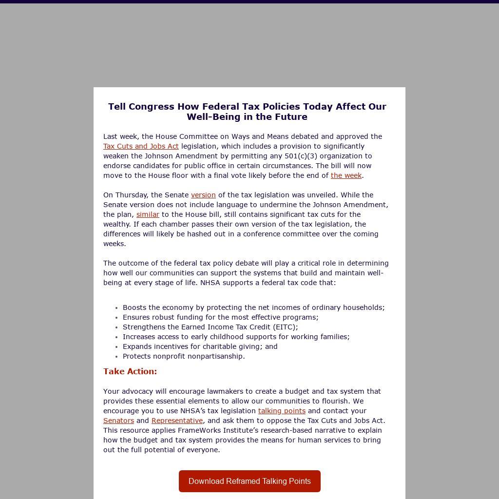 The outcome of the federal tax policy debate will play a critical role in determining how well our communities can support the systems that build and maintain well-being at every stage of life. NHSA supports a federal tax code that: