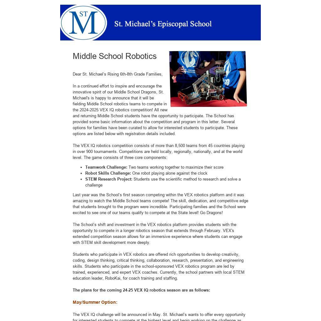 In a continued effort to inspire and encourage the innovative spirit of our Middle School Dragons, St. Michael's is happy to announce that it will be fielding Middle School robotics teams to compete in the 2024-2025 VEX IQ robotics competition! All new and returning Middle School students have the opportunity to participate. The School has provided some basic information about the competition and program in this letter. Several options for families have been curated to allow for interested students to participate. These options are listed below with registration details included.