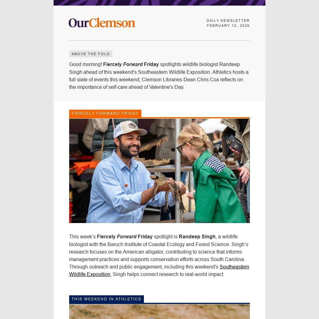 Good morning! Fiercely Forward Friday spotlights wildlife biologist Randeep Singh ahead of this weekend's Southeastern Wildlife Exposition. Athletics hosts a full slate of events this weekend; Clemson Libraries Dean Chris Cox reflects on the importance of self-care ahead of Valentine's Day.