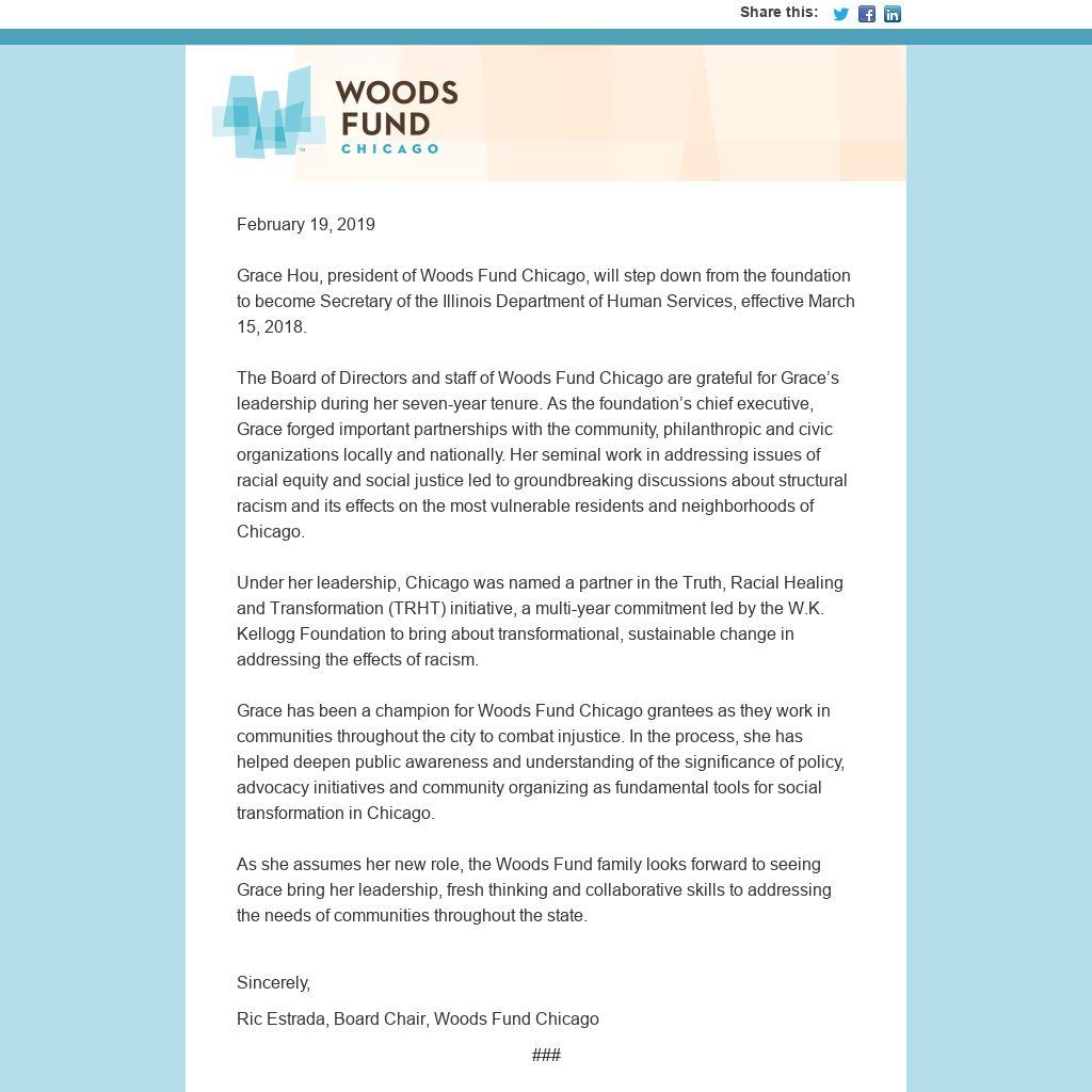 Grace Hou, president of Woods Fund Chicago, will step down from the foundation to become Secretary of the Illinois Department of Human Services, effective March 15, 2018.