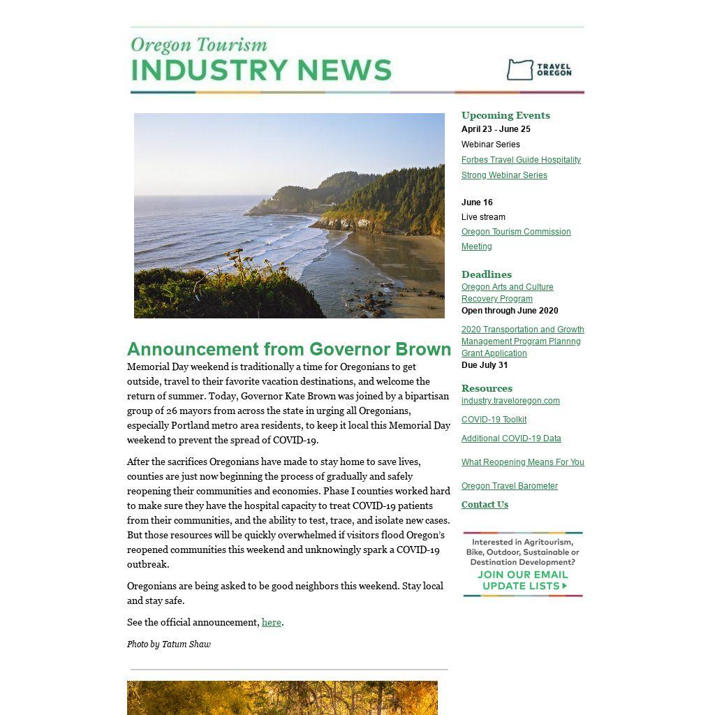 Memorial Day weekend is traditionally a time for Oregonians to get outside, travel to their favorite vacation destinations, and welcome the return of summer. Today, Governor Kate Brown was joined by a bipartisan group of 26 mayors from across the state in urging all Oregonians, especially Portland metro area residents, to keep it local this Memorial Day weekend to prevent the spread of COVID-19.