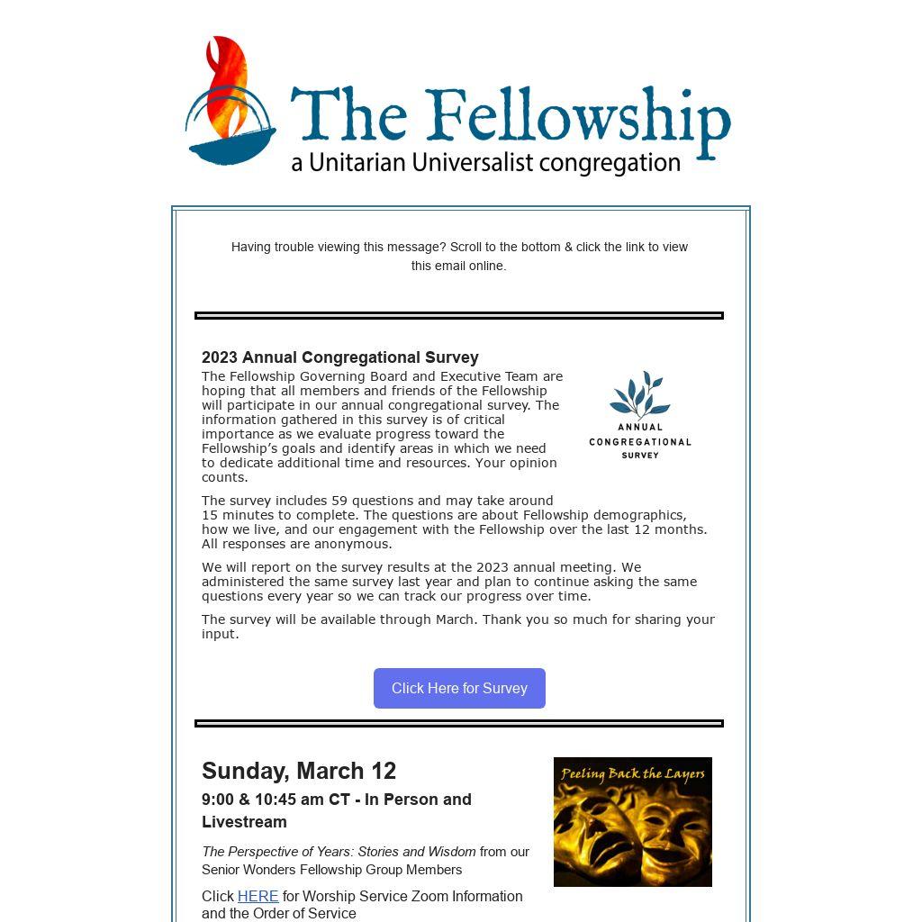 The Fellowship Governing Board and Executive Team are hoping that all members and friends of the Fellowship will participate in our annual congregational survey. The information gathered in this survey is of critical importance as we evaluate progress toward the Fellowship’s goals and identify areas in which we need to dedicate additional time and resources. Your opinion counts.