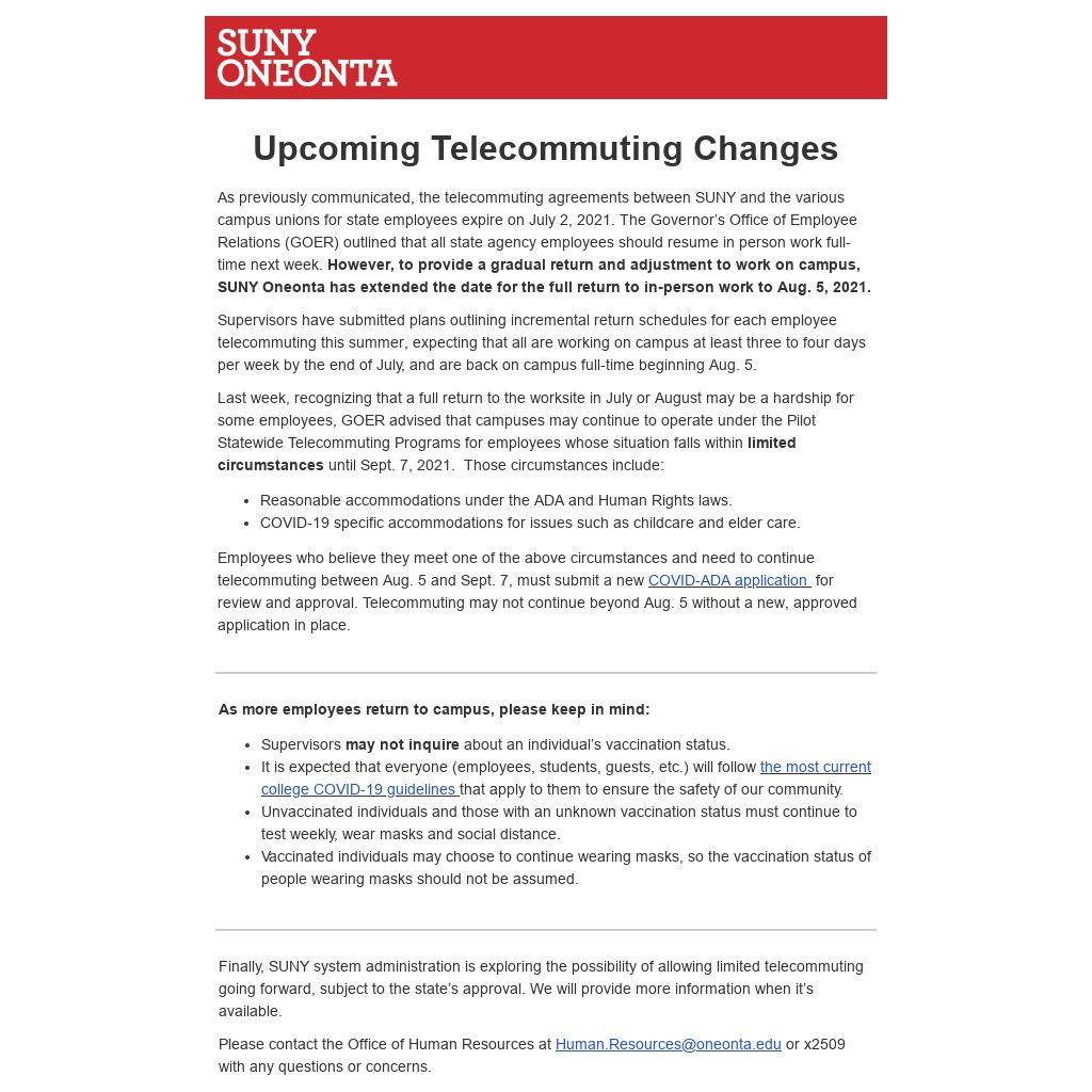 As previously communicated, the telecommuting agreements between SUNY and the various campus unions for state employees expire on July 2, 2021. The Governor’s Office of Employee Relations (GOER) outlined that all state agency employees should resume in person work full-time next week. However, to provide a gradual return and adjustment to work on campus, SUNY Oneonta has extended the date for the full return to in-person work to Aug. 5, 2021.