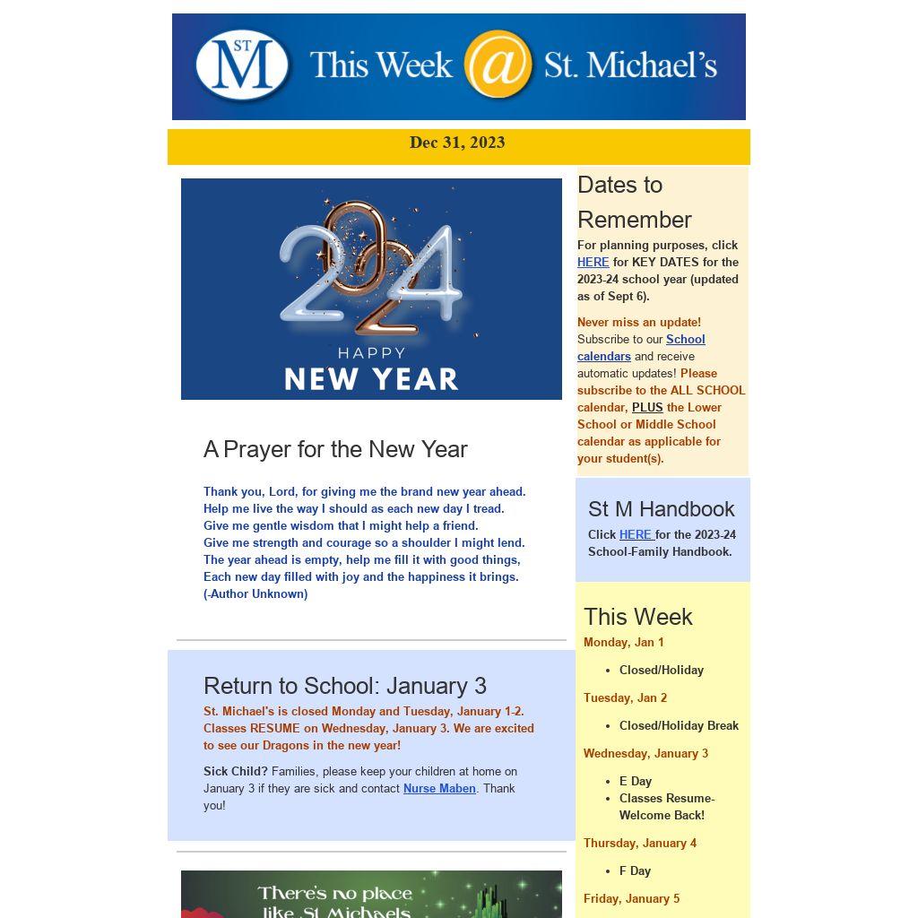 Return to School: January 3St. Michael's is closed Monday and Tuesday, January 1-2. Classes RESUME on Wednesday, January 3. We are excited to see our Dragons in the new year!