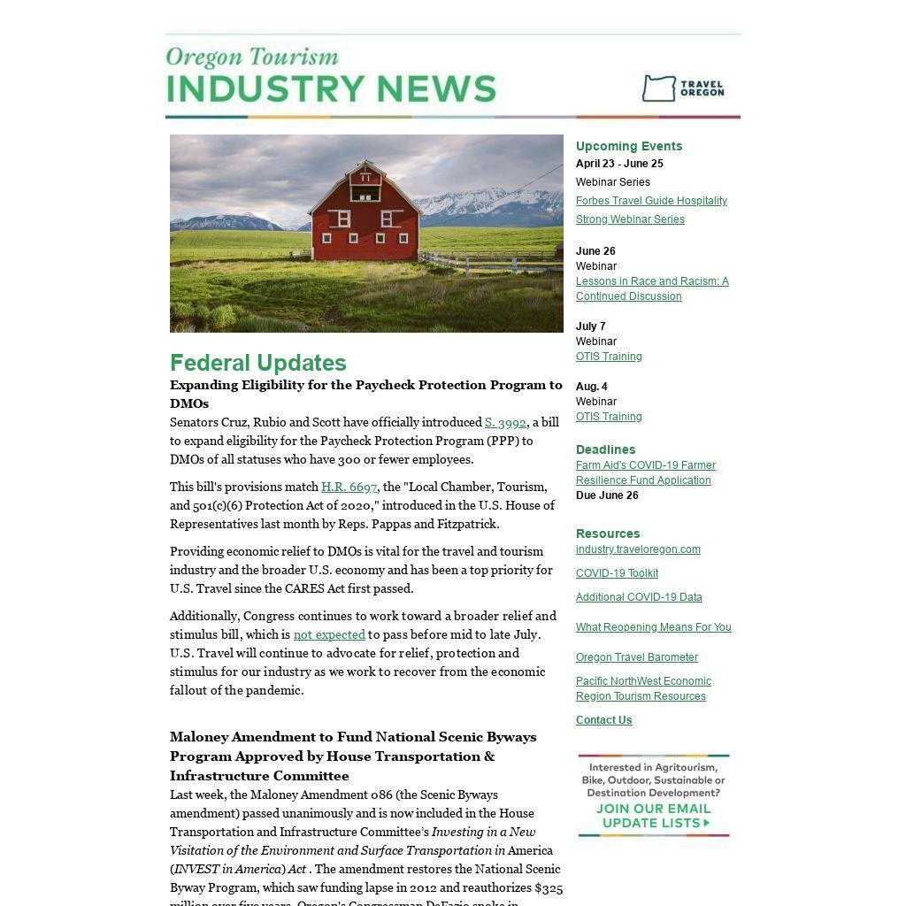 The Scenic Byways program is a critical piece of the Oregon road trip experience. According to research from Longwoods International on Oregon overnight travelers, touring trips are the most popular reason visitors came to our state (27%). In fact, Oregon visitors were 42% more likely than the average U.S. traveler to take a touring trip. INVEST in America Act now heads to the House floor for a vote.