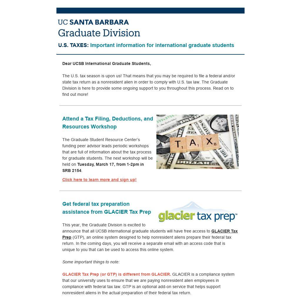 The U.S. tax season is upon us! That means that you may be required to file a federal and/or state tax return as a nonresident alien in order to comply with U.S. tax law. The Graduate Division is here to provide some ongoing support to you throughout this process. Read on to find out more!