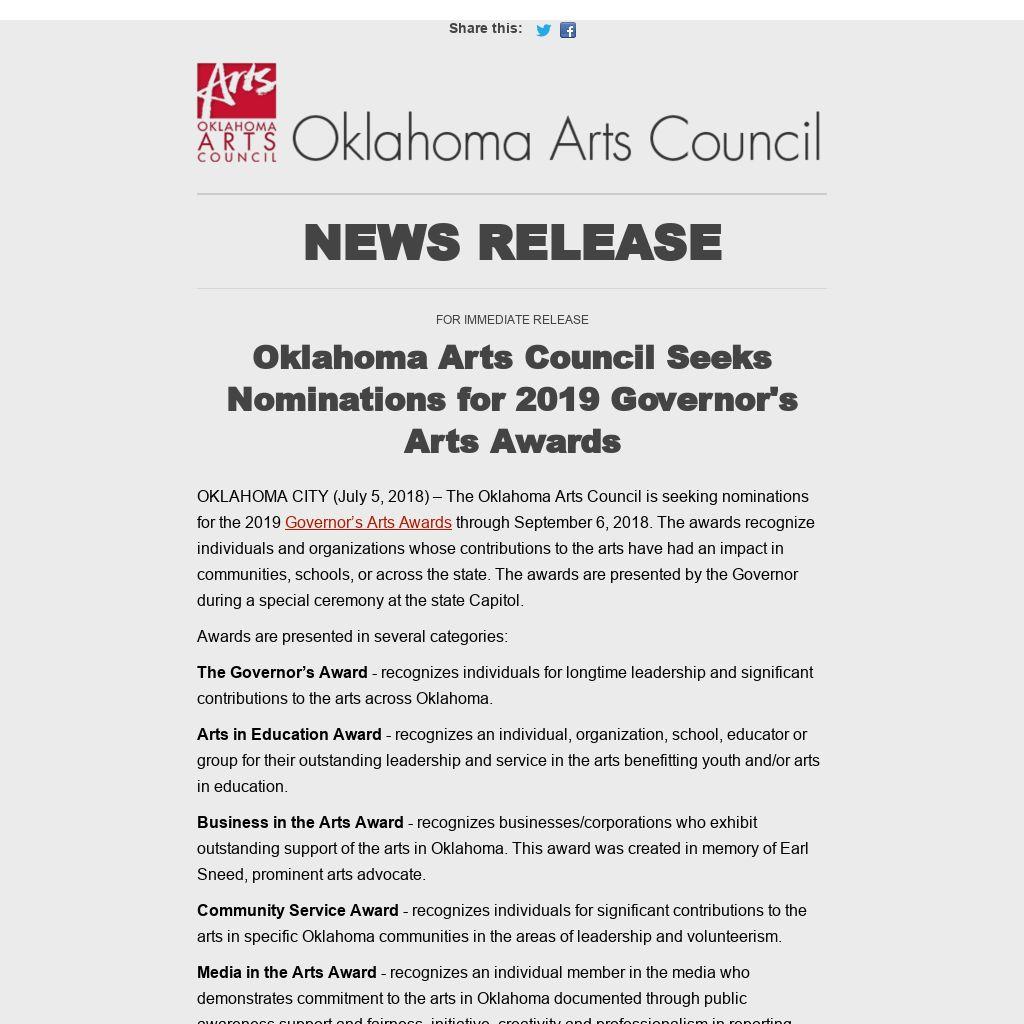 A nomination form is available at arts.ok.gov. Deadline for submissions is Thursday, September 6, 2018. For more information, contact Joel Gavin, Oklahoma Arts Council director of marketing and communications, at (405) 521-2037 or joel.gavin@arts.ok.gov.