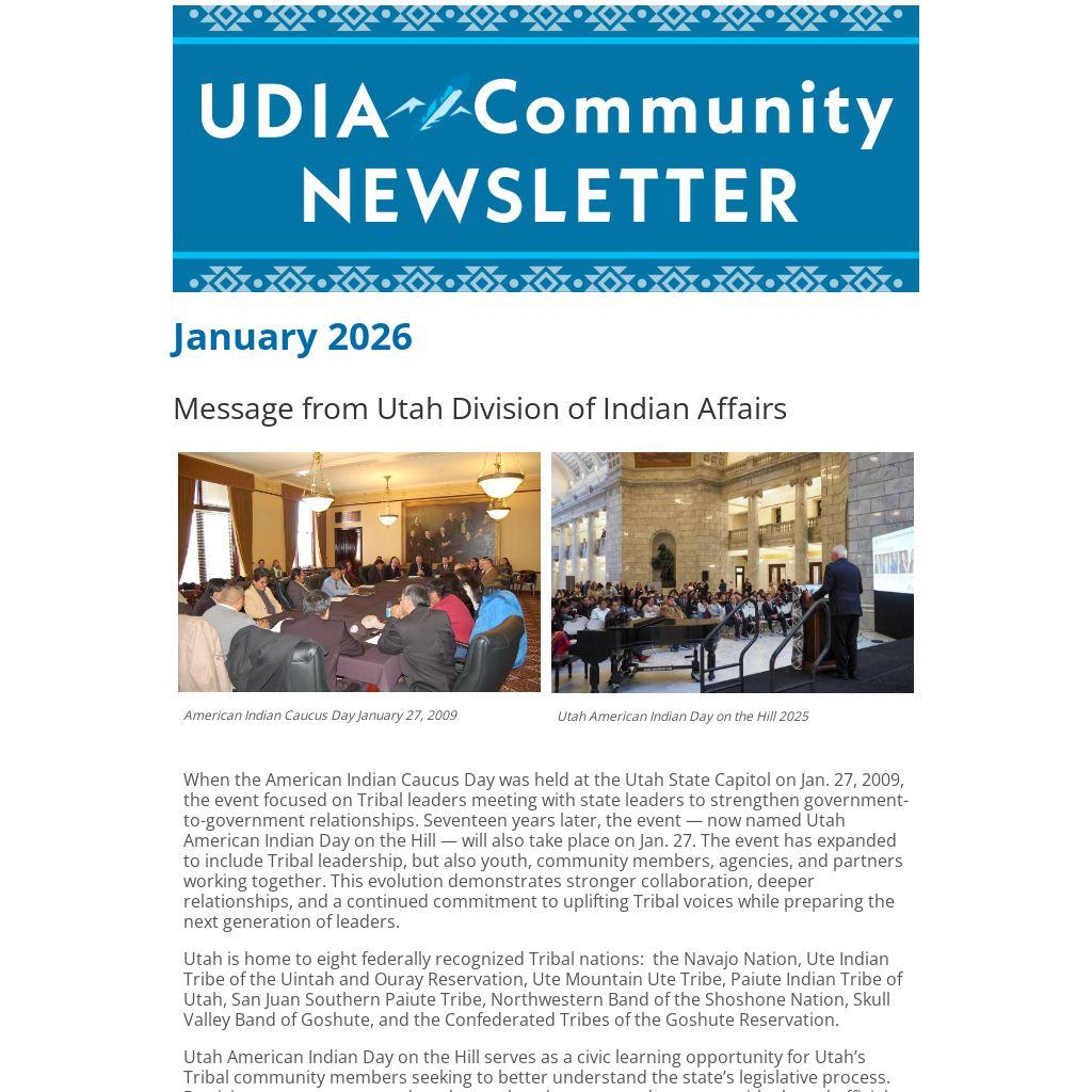 The views, thoughts, and opinions expressed by third-party organizations in this newsletter do not necessarily reflect those of the Utah Division of Indian Affairs. Links to external organizations or resources are provided for information only and should not be interpreted as endorsements or official positions of the Division.