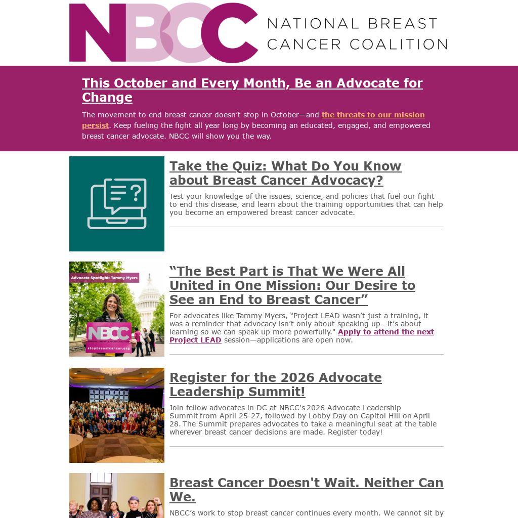 Join fellow advocates in DC at NBCC’s 2026 Advocate Leadership Summit from April 25-27, followed by Lobby Day on Capitol Hill on April 28. The Summit prepares advocates to take a meaningful seat at the table wherever breast cancer decisions are made. Register today!
