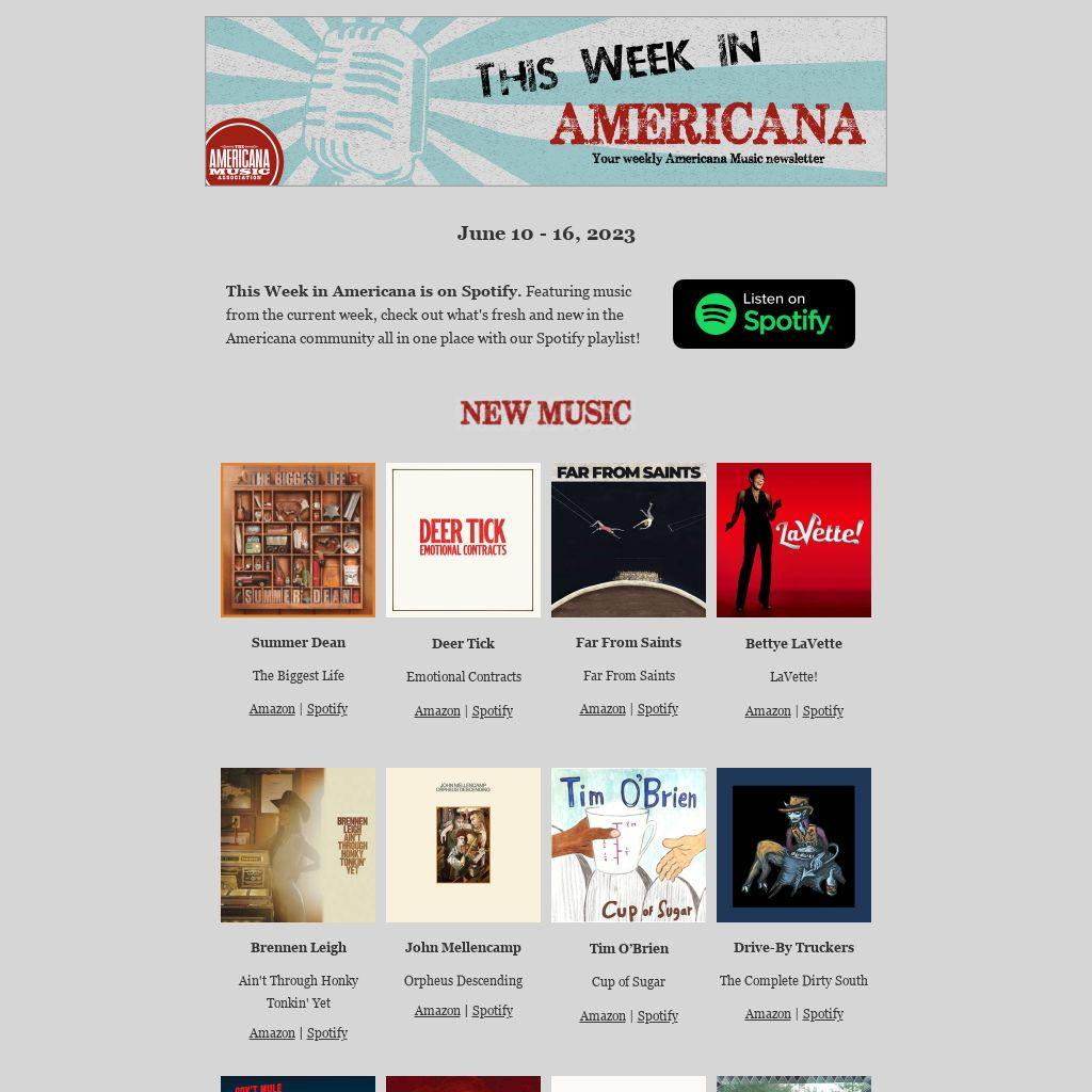 This Week in Americana is on Spotify. Featuring music from the current week, check out what's fresh and new in the Americana community all in one place with our Spotify playlist!