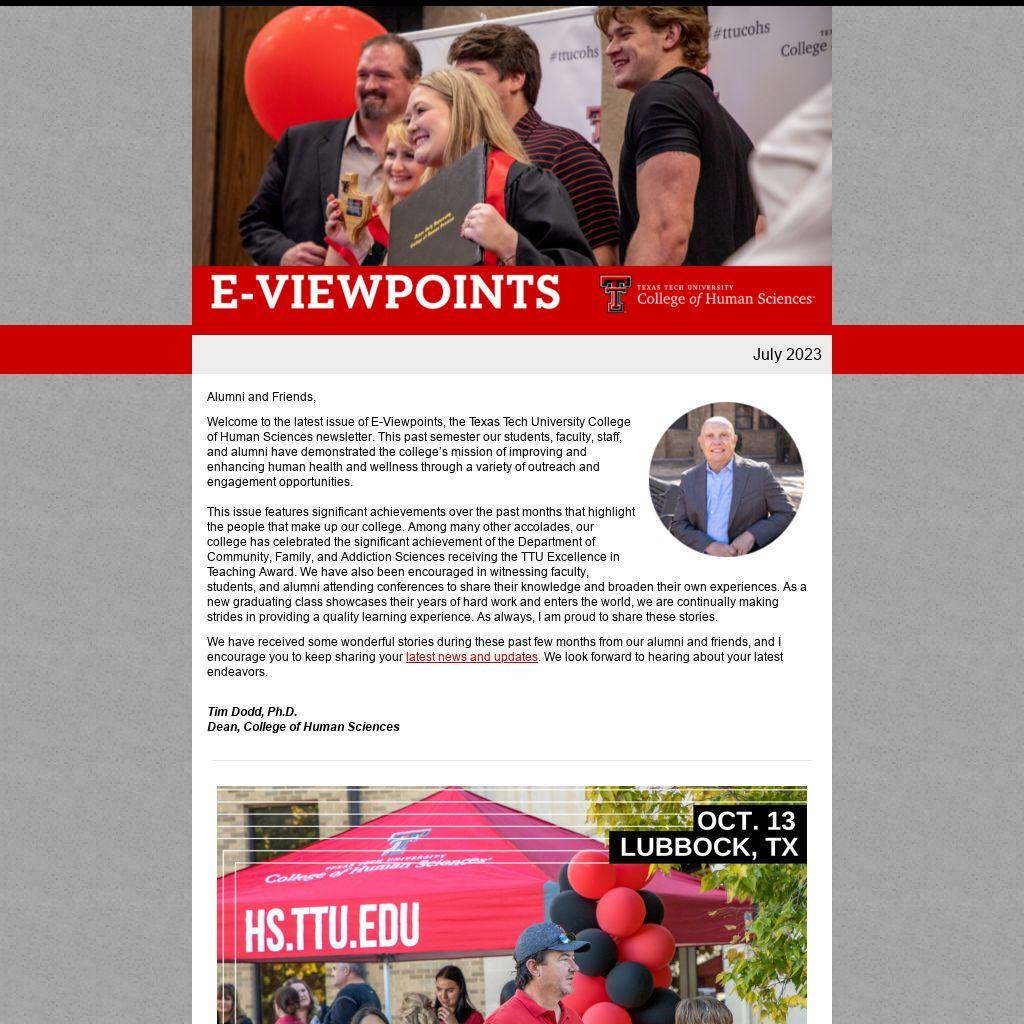 Welcome to the latest issue of E-Viewpoints, the Texas Tech University College of Human Sciences newsletter. This past semester our students, faculty, staff, and alumni have demonstrated the college’s mission of improving and enhancing human health and wellness through a variety of outreach and engagement opportunities.