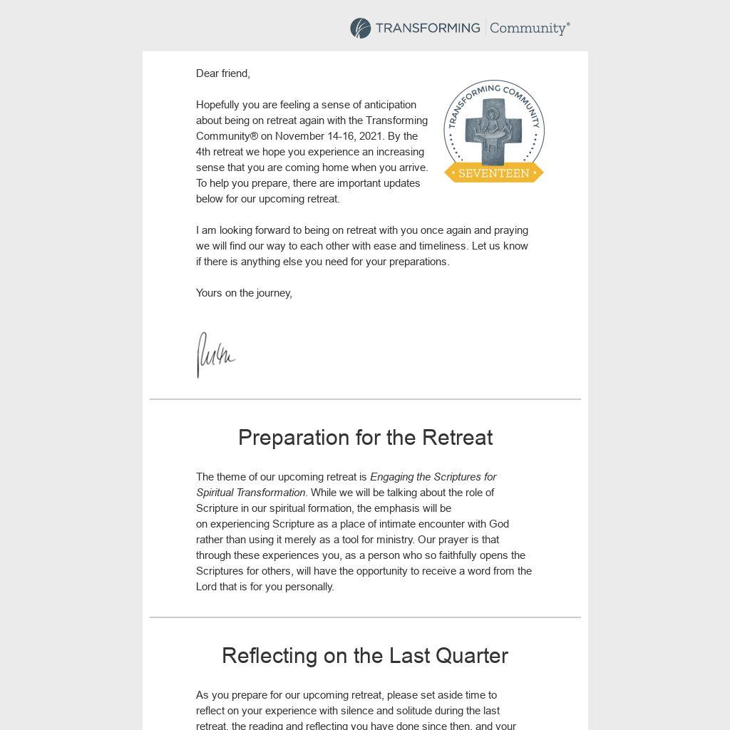 Our hope is that everyone will be seated with their small groups by 6:00 p.m., so the sharing can begin at that time. The TC17 team will be following up with an email that identifies the convener for each group, along with simple guidelines for making that time as profitable as possible. Gathering Prayer will follow dinner at 7:00 p.m.