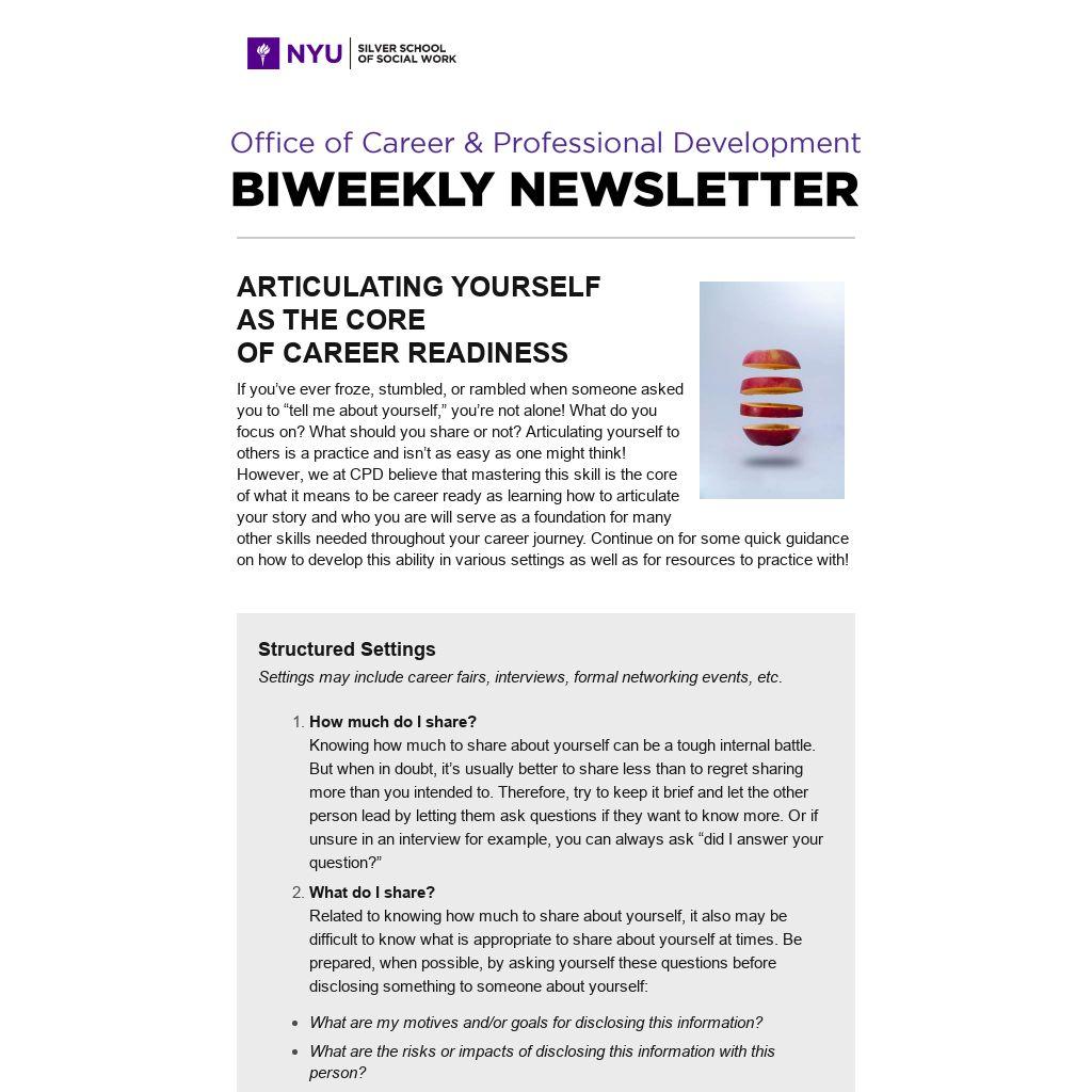 OF CAREER READINESSIf you’ve ever froze, stumbled, or rambled when someone asked you to “tell me about yourself,” you’re not alone! What do you focus on? What should you share or not? Articulating yourself to others is a practice and isn’t as easy as one might think! However, we at CPD believe that mastering this skill is the core of what it means to be career ready as learning how to articulate your story and who you are will serve as a foundation for many other skills needed throughout your career journey. Continue on for some quick guidance on how to develop this ability in various settings as well as for resources to practice with!