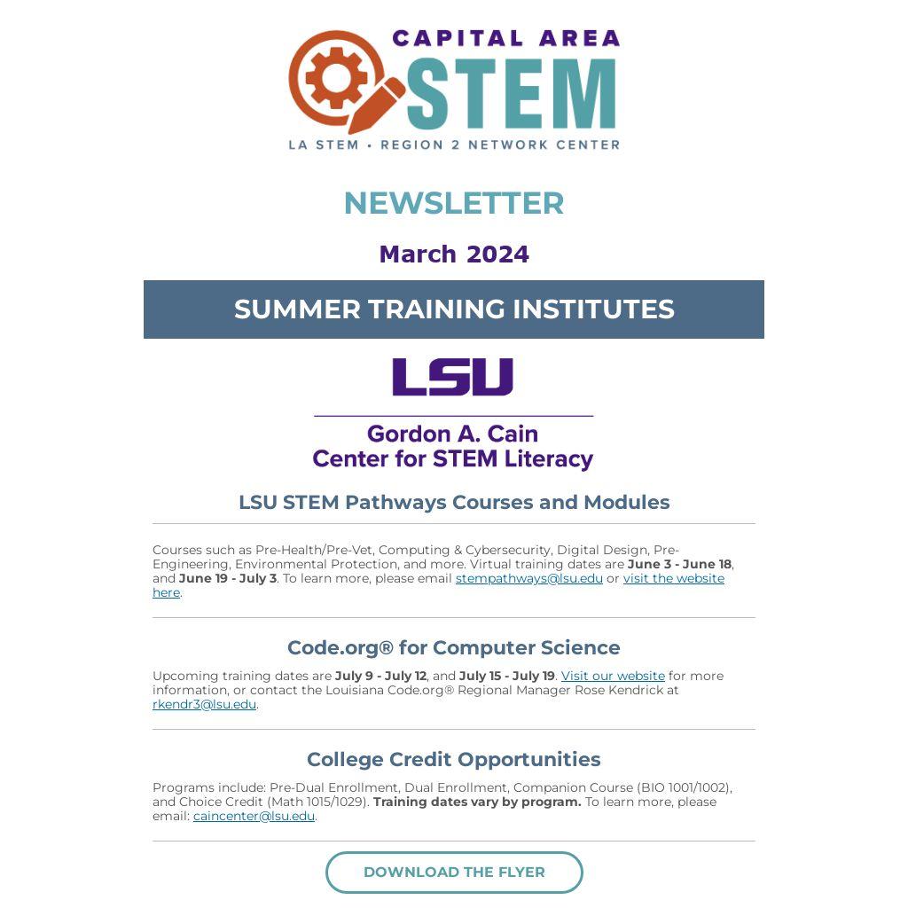 Courses such as Pre-Health/Pre-Vet, Computing & Cybersecurity, Digital Design, Pre-Engineering, Environmental Protection, and more. Virtual training dates are June 3 - June 18, and June 19 - July 3. To learn more, please email stempathways@lsu.edu or visit the website here.