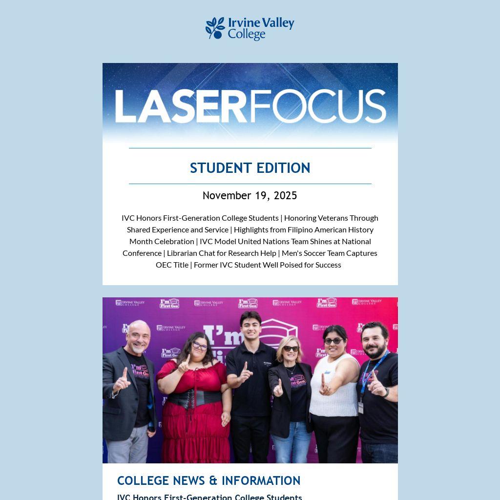 IVC Honors First-Generation College Students | Honoring Veterans Through Shared Experience and Service | Highlights from Filipino American History Month Celebration | IVC Model United Nations Team Shines at National Conference | Librarian Chat for Research Help | Men's Soccer Team Captures OEC Title | Former IVC Student Well Poised for Success