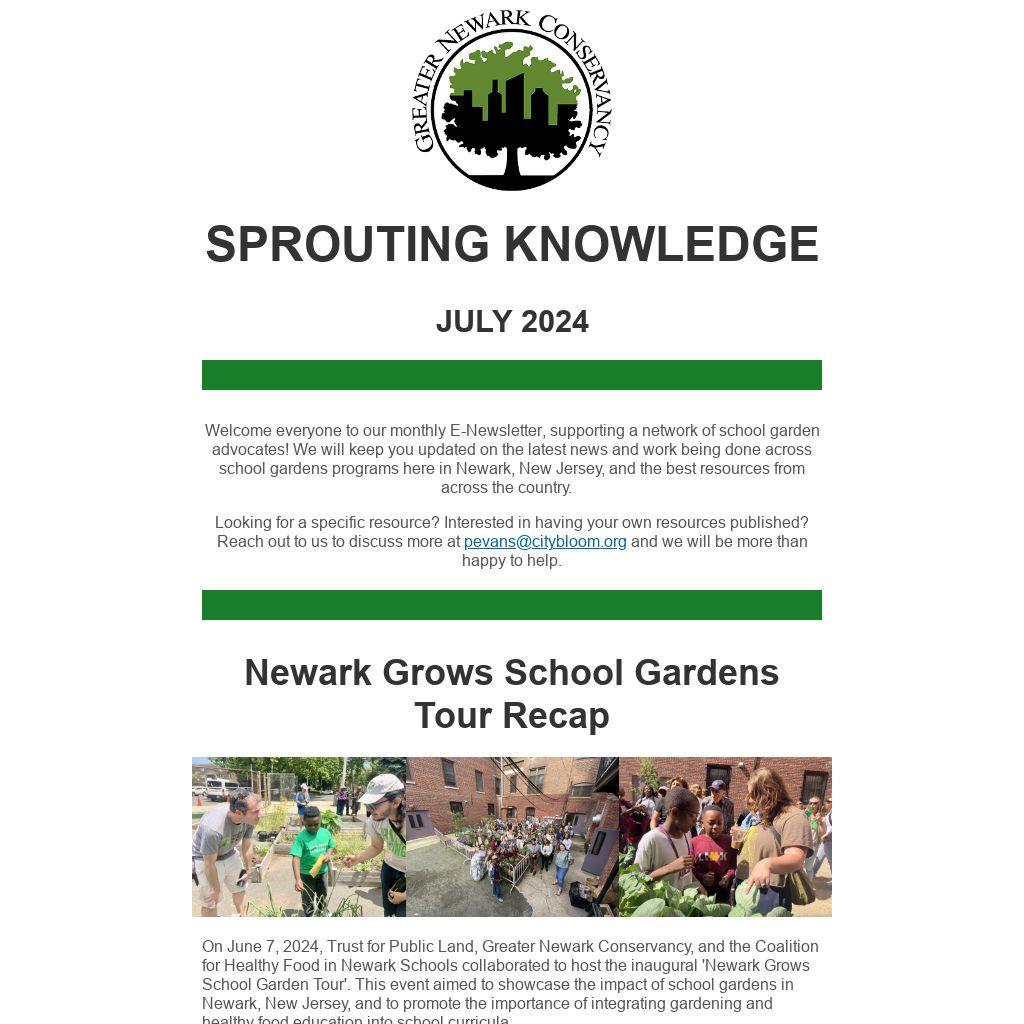 On June 7, 2024, Trust for Public Land, Greater Newark Conservancy, and the Coalition for Healthy Food in Newark Schools collaborated to host the inaugural 'Newark Grows School Garden Tour'. This event aimed to showcase the impact of school gardens in Newark, New Jersey, and to promote the importance of integrating gardening and healthy food education into school curricula.