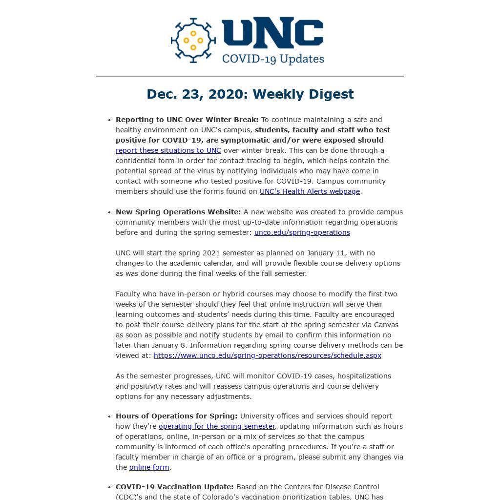 - New Spring Operations Website: A new website was created to provide campus community members with the most up-to-date information regarding operations before and during the spring semester: unco.edu/spring-operations
