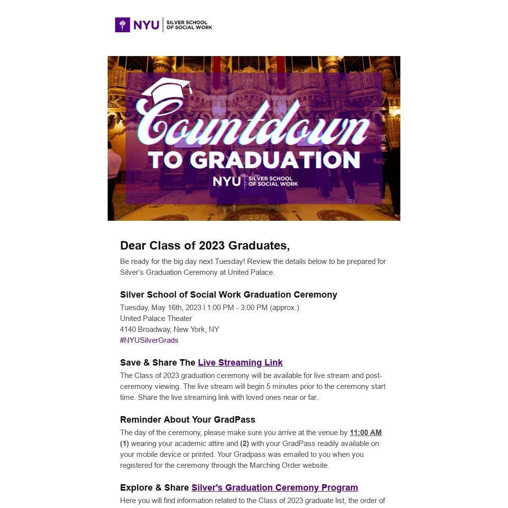 We encourage you to arrive with your phone fully charged and/or bring a portable power bank so you can engage with our Social Media Wall (using #NYUSilverGrads from public Instagram feeds and Twitter accounts), view our