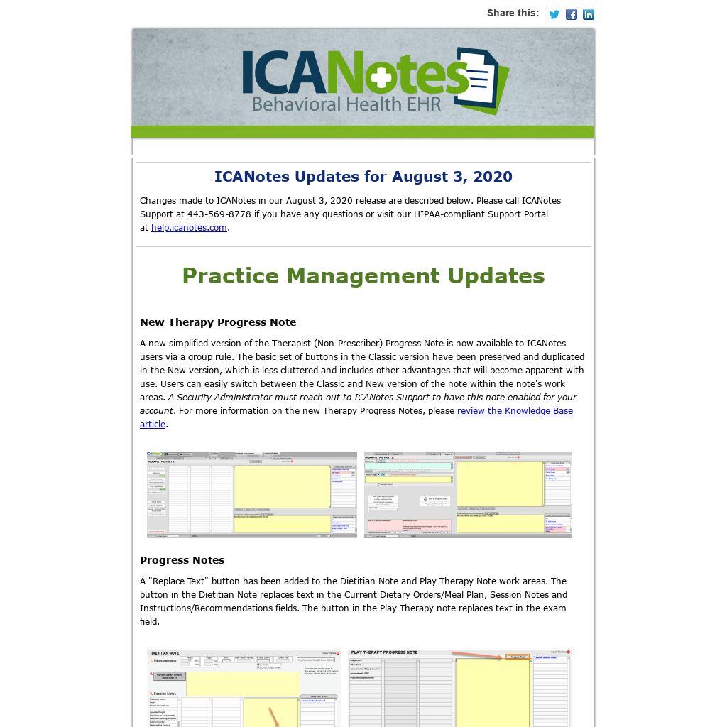 Changes made to ICANotes in our August 3, 2020 release are described below. Please call ICANotes Support at 443-569-8778 if you have any questions or visit our HIPAA-compliant Support Portal at help.icanotes.com.