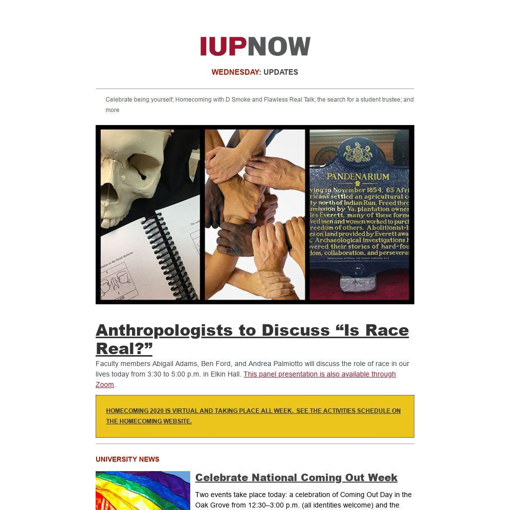 Distributed to IUP employees and students four days a week, IUP Now is the official newsletter of Indiana University of Pennsylvania. It features news from across the IUP website, compiled by the Division of Marketing and Communications. Find out how to get your news and events in IUP Now.