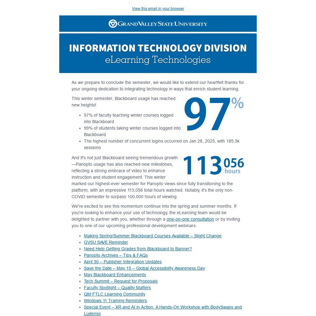And it's not just Blackboard seeing tremendous growth—Panopto usage has also reached new milestones, reflecting a strong embrace of video to enhance instruction and student engagement. This winter marked our highest-ever semester for Panopto views since fully transitioning to the platform, with an impressive 113,056 total hours watched. Notably, it's the only non-COVID semester to surpass 100,000 hours of viewing.