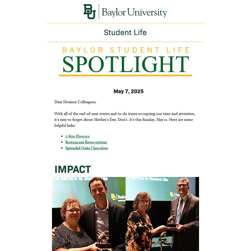 Staff Retirements in Student Life – Special thanks for the combined 132 years of service to Baylor University represented by the group below. From managing data and records to managing the entire division, hundreds of thousands of students have been impacted by your work and are changing the world today because of your dedication to their success!