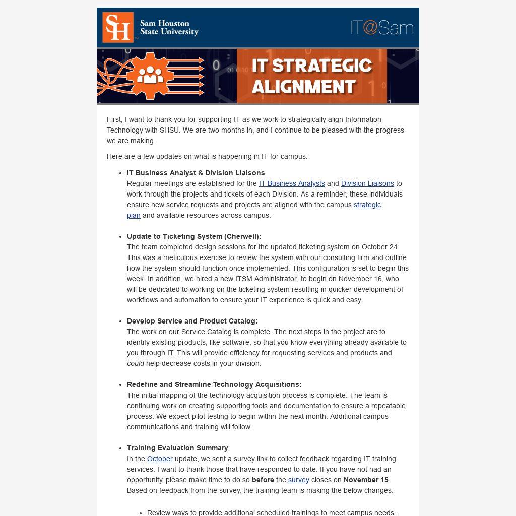 First, I want to thank you for supporting IT as we work to strategically align Information Technology with SHSU. We are two months in, and I continue to be pleased with the progress we are making.
