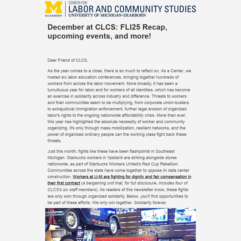 Just this month, fights like these have been flashpoints in Southeast Michigan. Starbucks workers in Ypsilanti are striking alongside stores nationwide, as part of Starbucks Workers United's Red Cup Rebellion. Communities across the state have come together to oppose AI data center construction. Workers at U-M are fighting for dignity and fair compensation in their first contract (a bargaining unit that, for full disclosure, includes four of CLCS's six staff members). As readers of this newsletter know, these fights are only won through organized solidarity. Below, you'll find opportunities to be part of these efforts. We only win together. Solidarity forever.