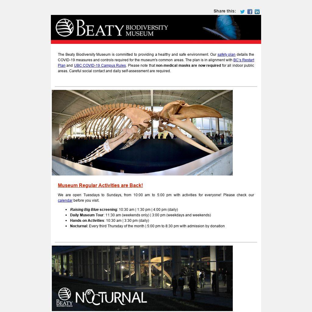 | About the Museum The Beaty Biodiversity Museum is Vancouver's natural history museum, dedicated to building greater understanding, and a shared sense of community and wonder, around biodiversity. Follow us on our social media channels!