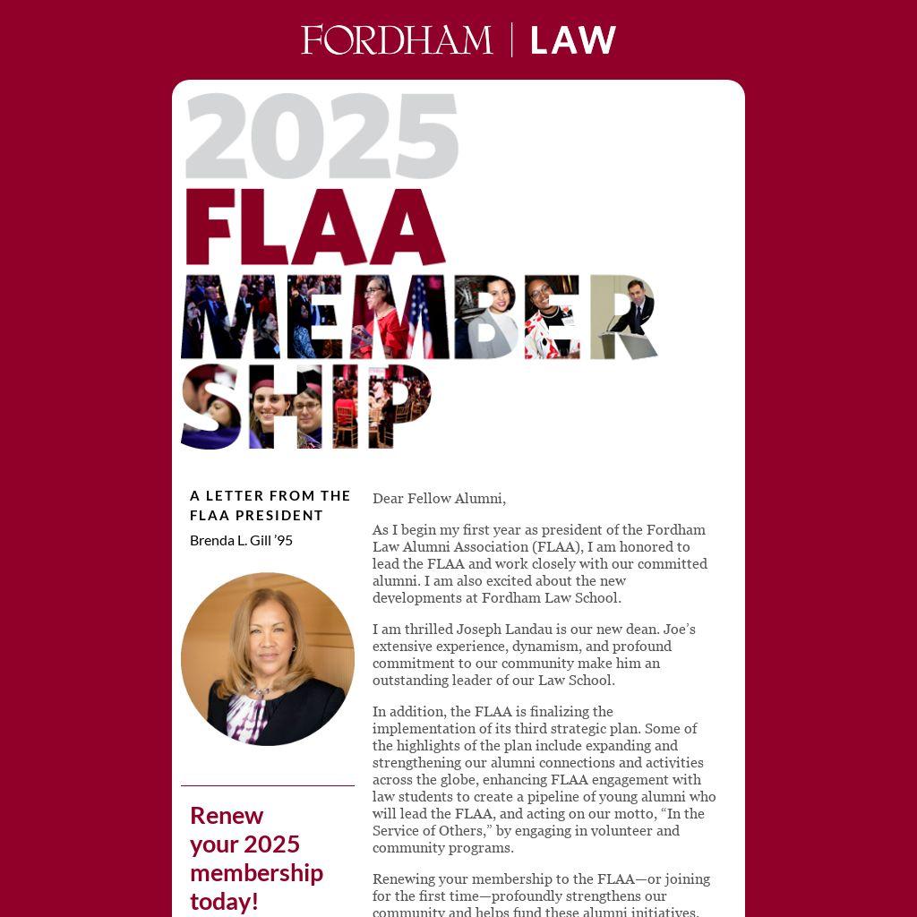 Renewing your membership to the FLAA—or joining for the first time—profoundly strengthens our community and helps fund these alumni initiatives. Ultimately, the strength of our network depends on you—your participation in our varied alumni and CLE programs, your hiring of Fordham lawyers, and your mentoring of Fordham Law students and recent graduates. Your annual membership contribution also provides Fordham Law alumni with certain member benefits, such as discounts on CLEs, access to the law library, and other discount programs.