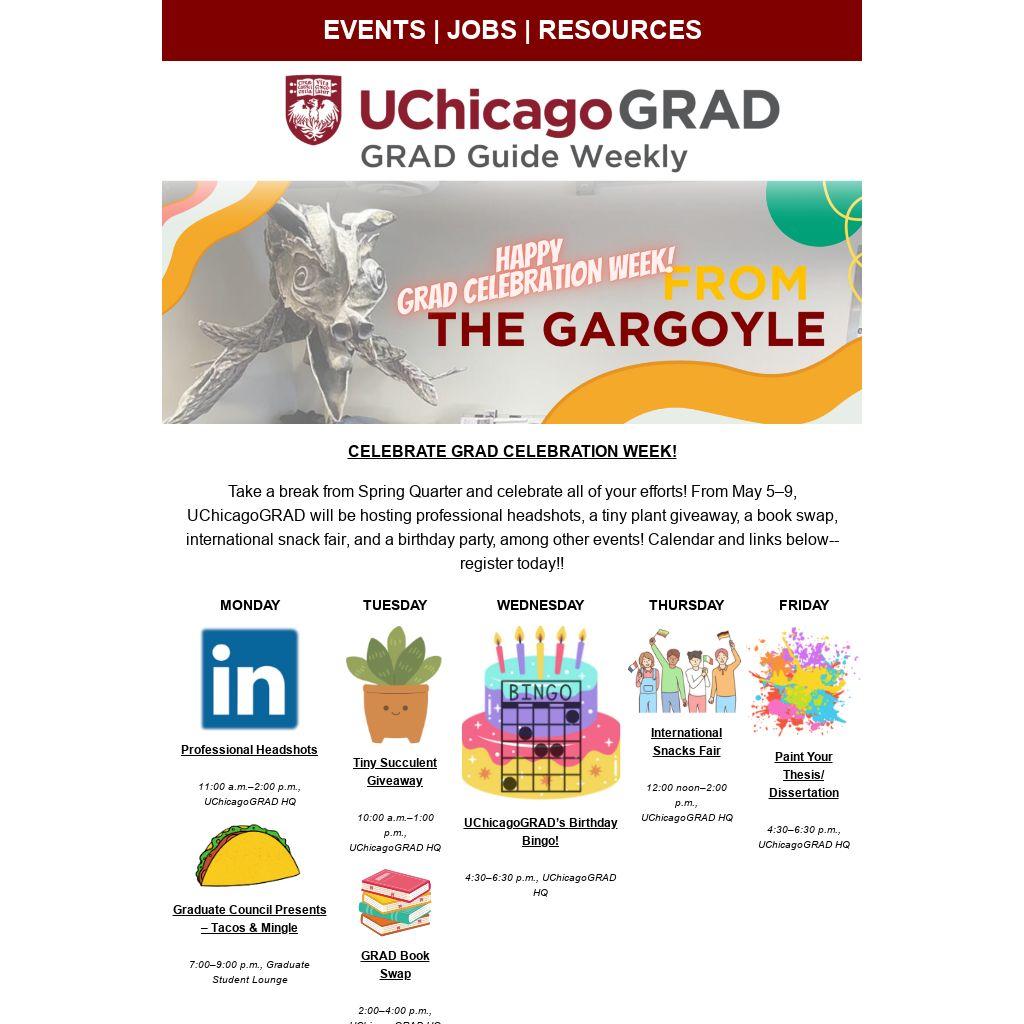 Take a break from Spring Quarter and celebrate all of your efforts! From May 5–9, UChicagoGRAD will be hosting professional headshots, a tiny plant giveaway, a book swap, international snack fair, and a birthday party, among other events! Calendar and links below--register today!!
