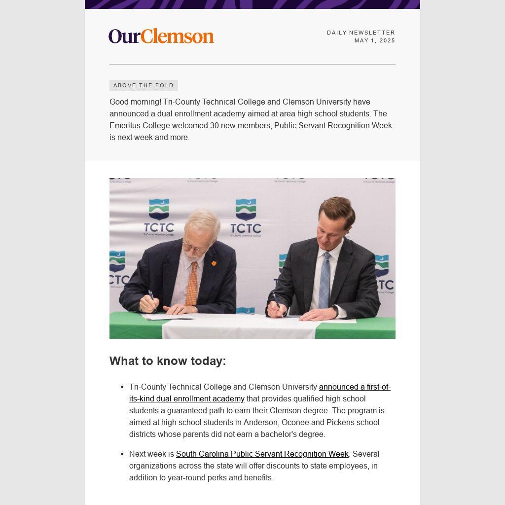 Good morning! Tri-County Technical College and Clemson University have announced a dual enrollment academy aimed at area high school students. The Emeritus College welcomed 30 new members, Public Servant Recognition Week is next week and more.