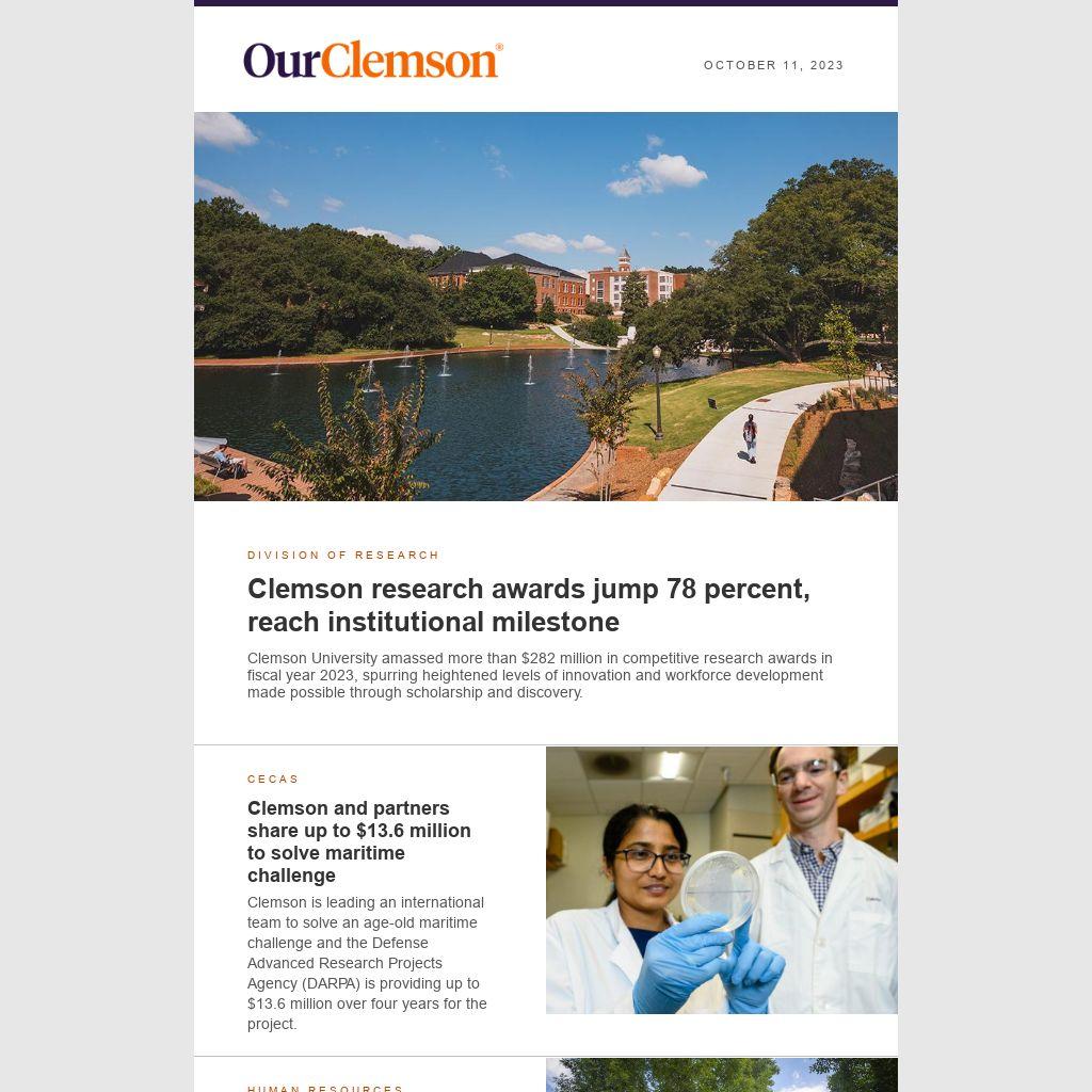 Clemson University amassed more than $282 million in competitive research awards in fiscal year 2023, spurring heightened levels of innovation and workforce development made possible through scholarship and discovery.