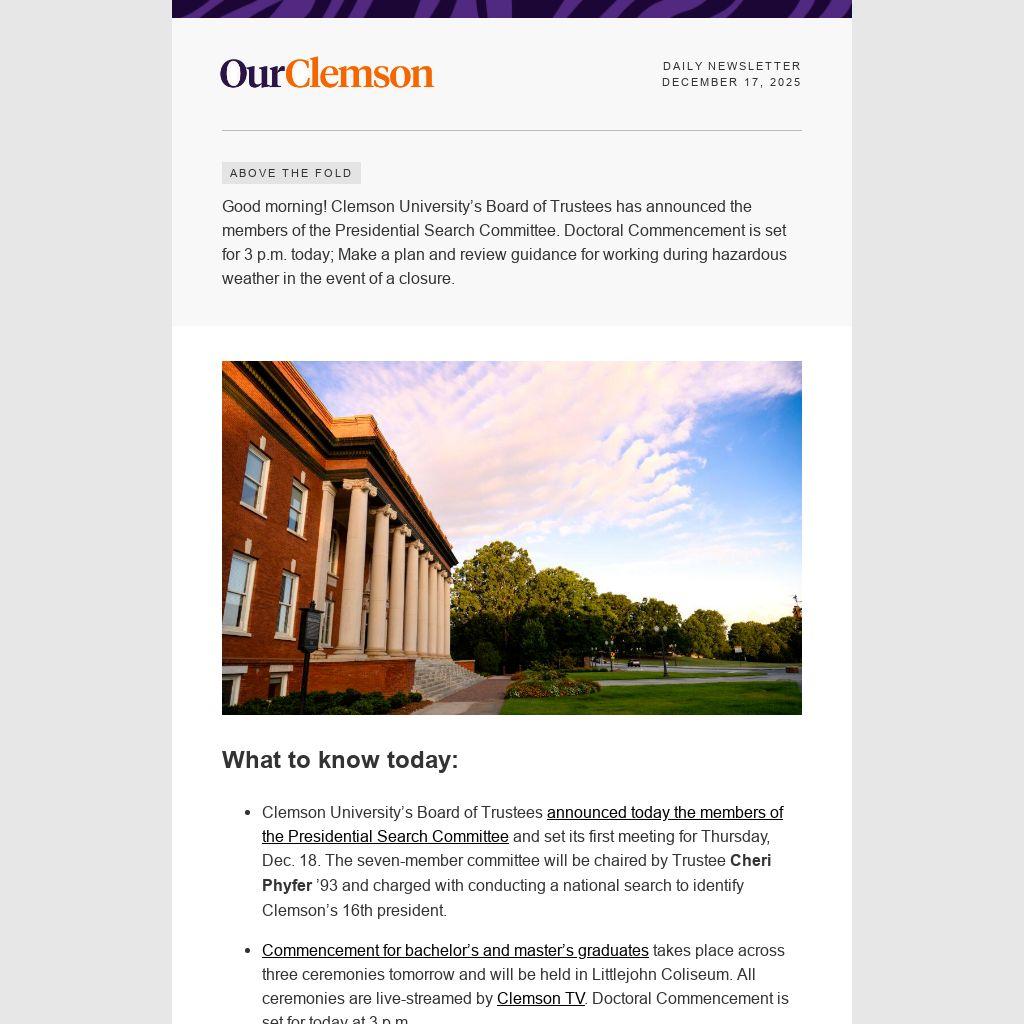 Good morning! Clemson University’s Board of Trustees has announced the members of the Presidential Search Committee. Doctoral Commencement is set for 3 p.m. today; Make a plan and review guidance for working during hazardous weather in the event of a closure.