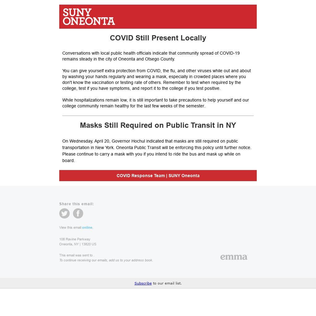 Conversations with local public health officials indicate that community spread of COVID-19 remains steady in the city of Oneonta and Otsego County.