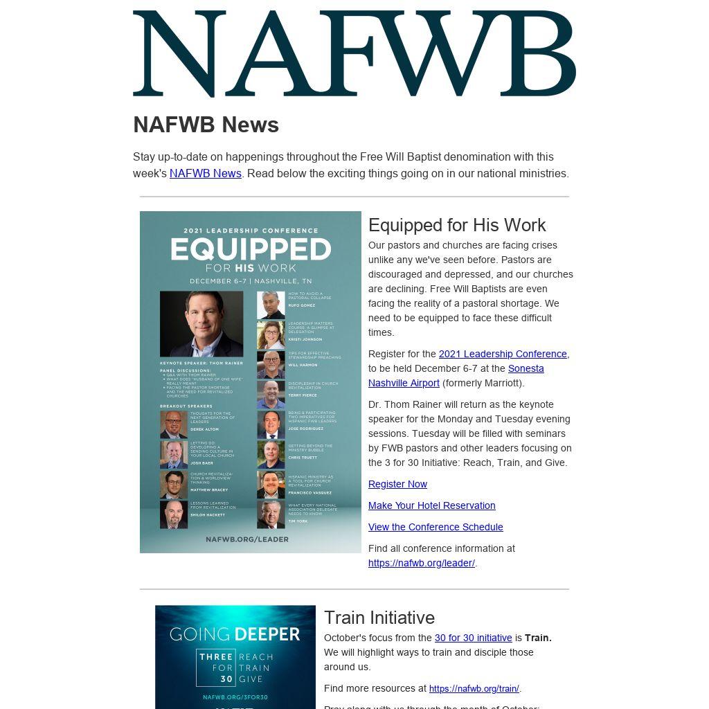 Dr. Thom Rainer will return as the keynote speaker for the Monday and Tuesday evening sessions. Tuesday will be filled with seminars by FWB pastors and other leaders focusing on the 3 for 30 Initiative: Reach, Train, and Give.