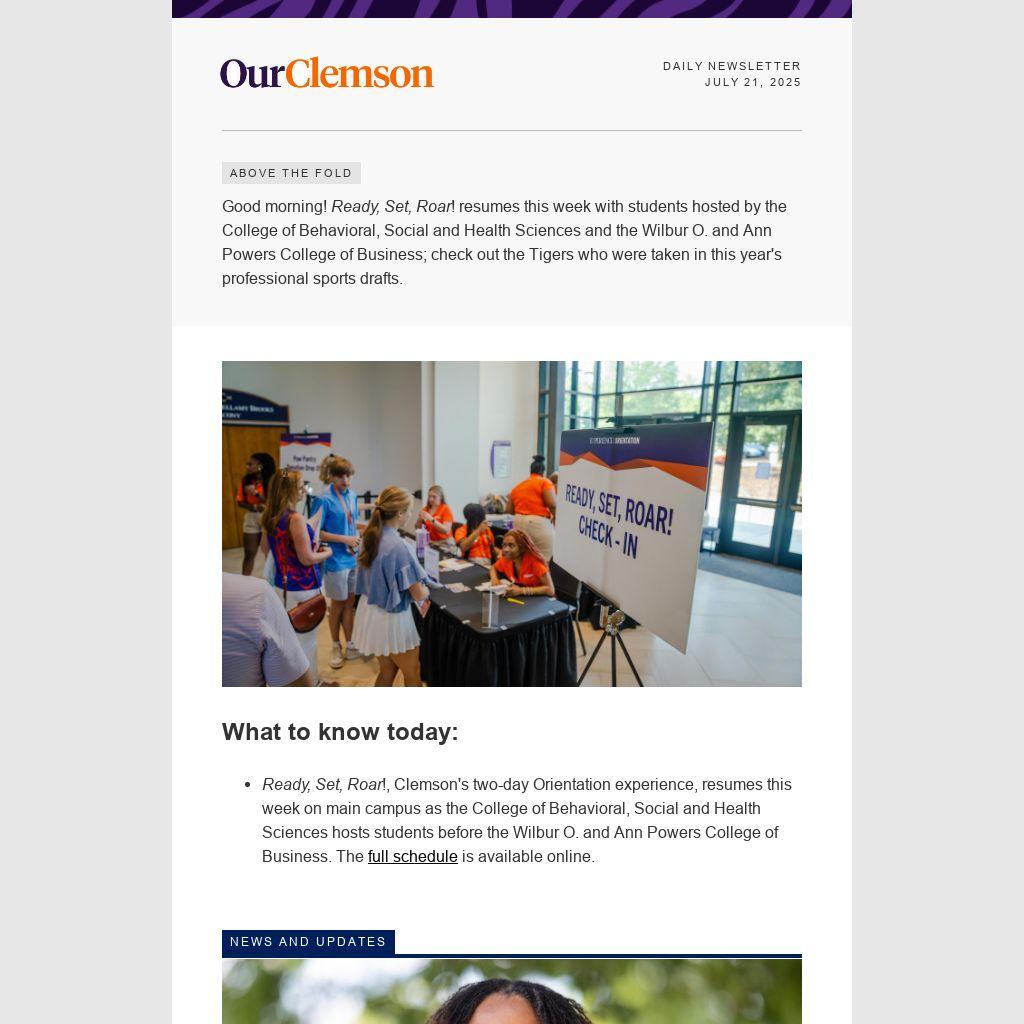 Good morning! Ready, Set, Roar! resumes this week with students hosted by the College of Behavioral, Social and Health Sciences and the Wilbur O. and Ann Powers College of Business; check out the Tigers who were taken in this year's professional sports drafts.