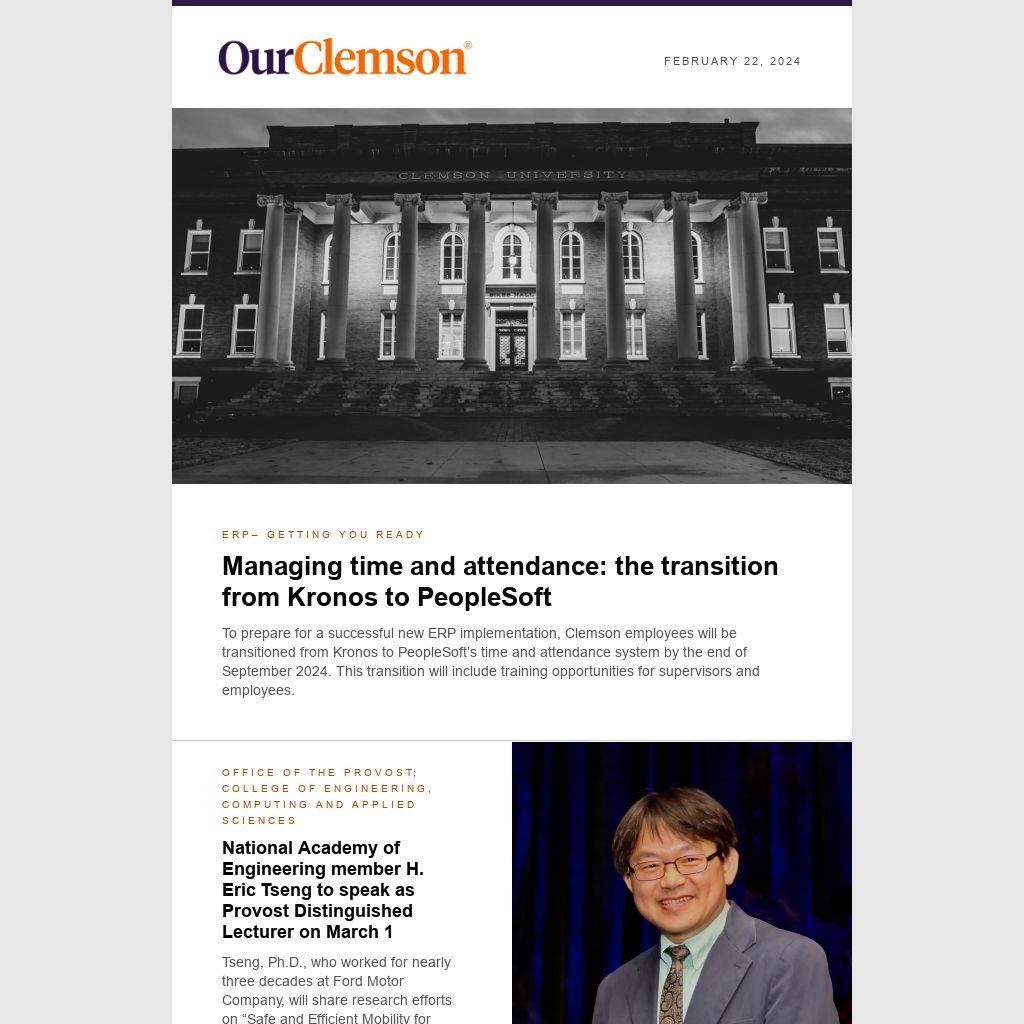 To prepare for a successful new ERP implementation, Clemson employees will be transitioned from Kronos to PeopleSoft’s time and attendance system by the end of September 2024. This transition will include training opportunities for supervisors and employees.