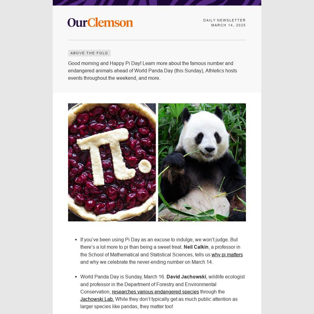 Good morning and Happy Pi Day! Learn more about the famous number and endangered animals ahead of World Panda Day (this Sunday), Athletics hosts events throughout the weekend, and more.